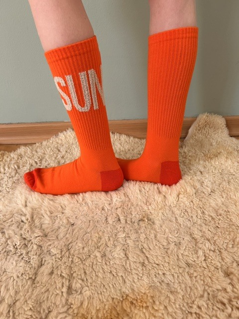 Unsere Socken knallig Orange mit SUN abgesetzt und angeraut